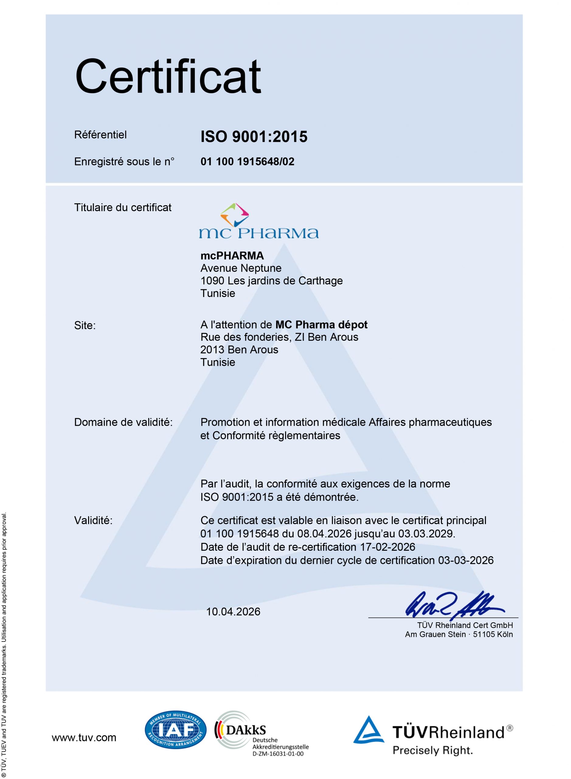 Chez mc Pharma, la qualité demeure au cœur de notre mission. Ce renouvellement renforce notre volonté de poursuivre une démarche d’amélioration continue au service de nos clients et partenaires.